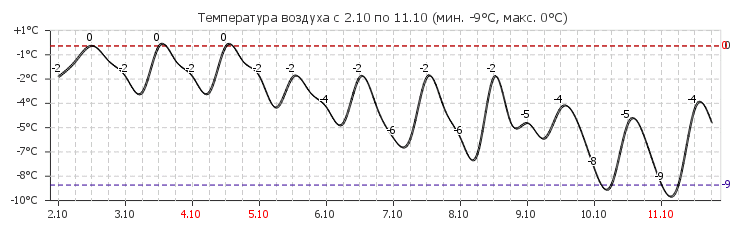 ночь -9°C, без осадков, малооблачно, ветер Восточный,2 м/с, влажность 94%